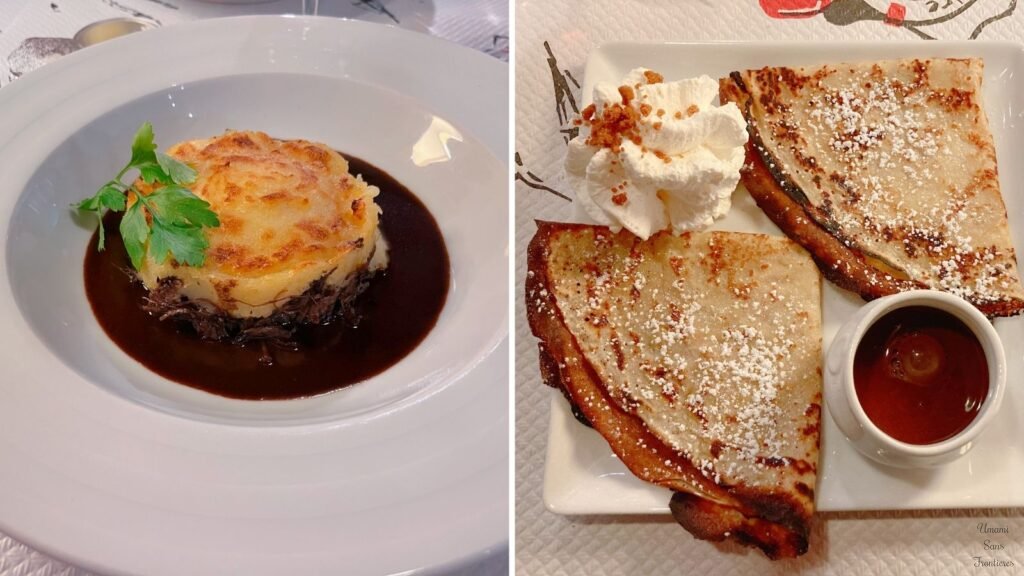 We both ordered Parmentier de canard, tender duck layered with creamy mashed potatoes, followed by a vanilla-scented crêpe — the perfect ending to our stay in La Rochelle. (A small note: Our visit was a few years ago, so the menu might be different now.)
