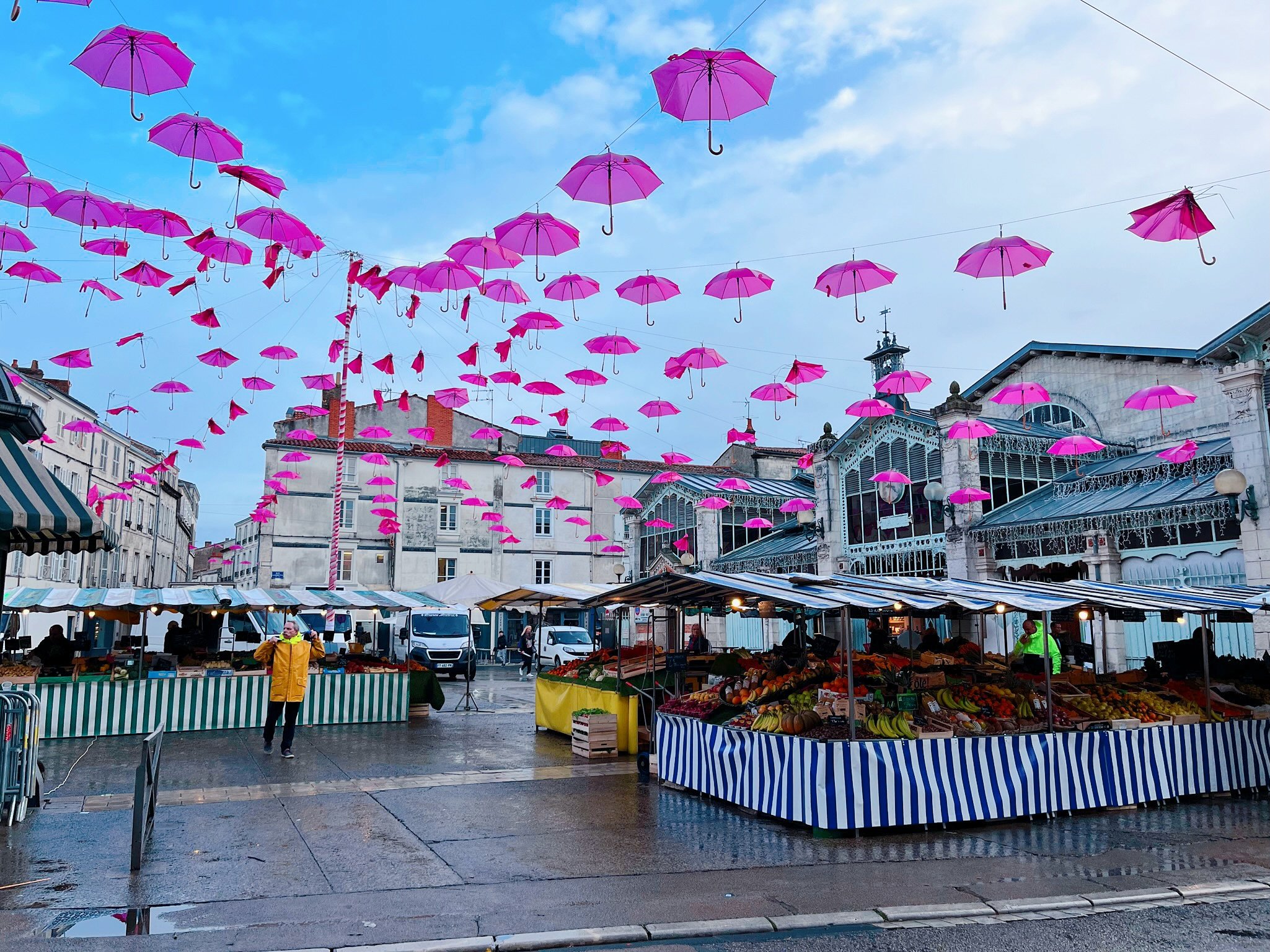 Outside, colorful umbrella decorations stretched across the square, catching the morning light and turning the market into a cheerful open-air gallery. Beneath the umbrellas, stalls overflowed with fruit and vegetables — oranges, tomatoes, herbs — filling the air with their fresh, vivid scents.