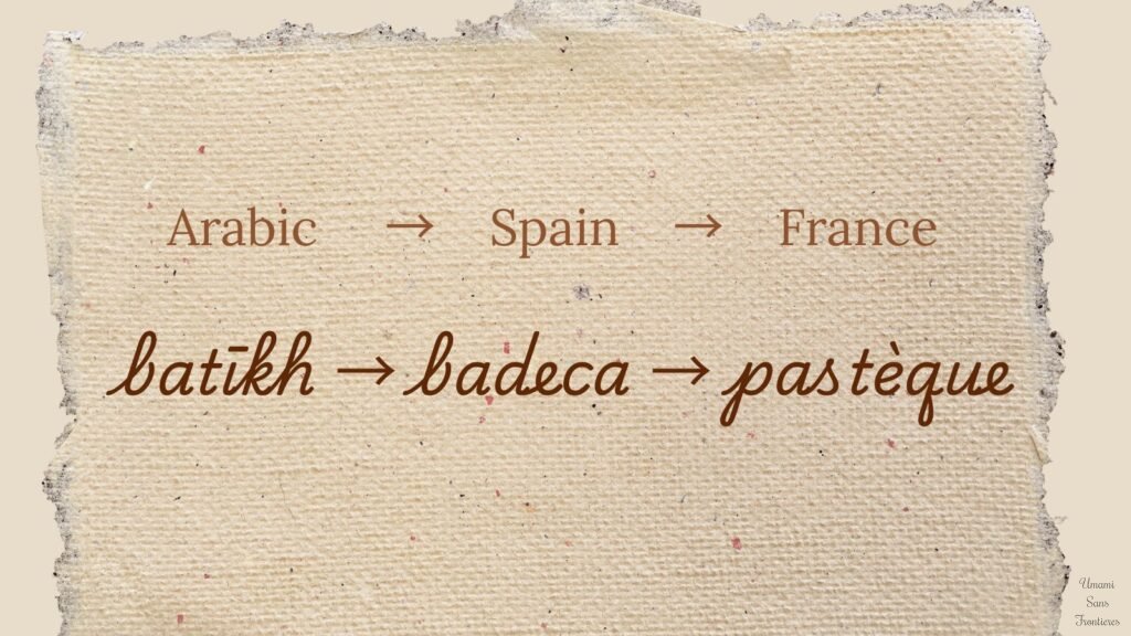 The word batīkh traveled to medieval Spain, transformed into forms like badeca, and later made its way across Mediterranean trade routes into French—eventually becoming the pastèque we know today.