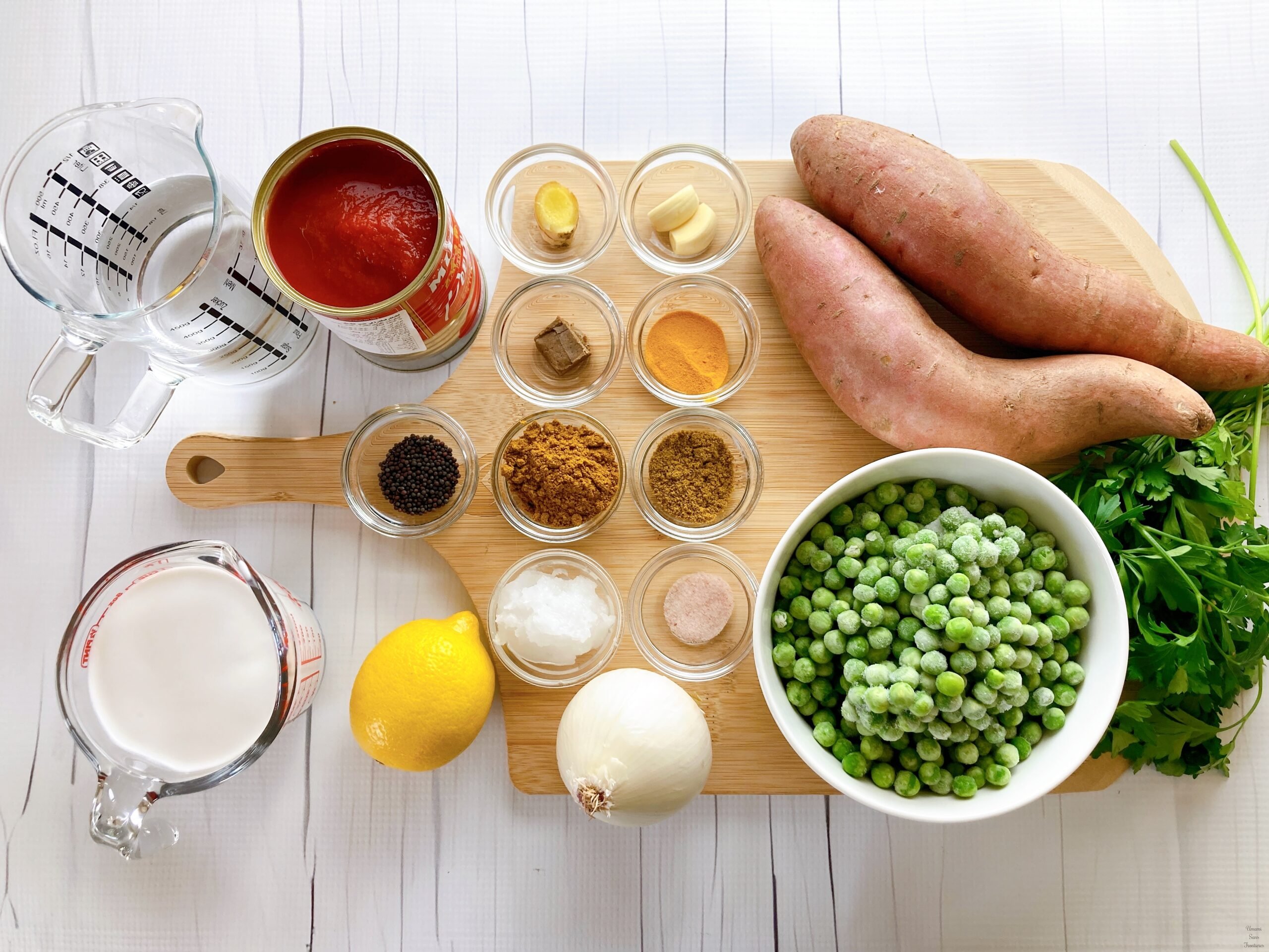 South Indian sweet potato curry pappadam lemon spoon rice parsley black mustard seeds