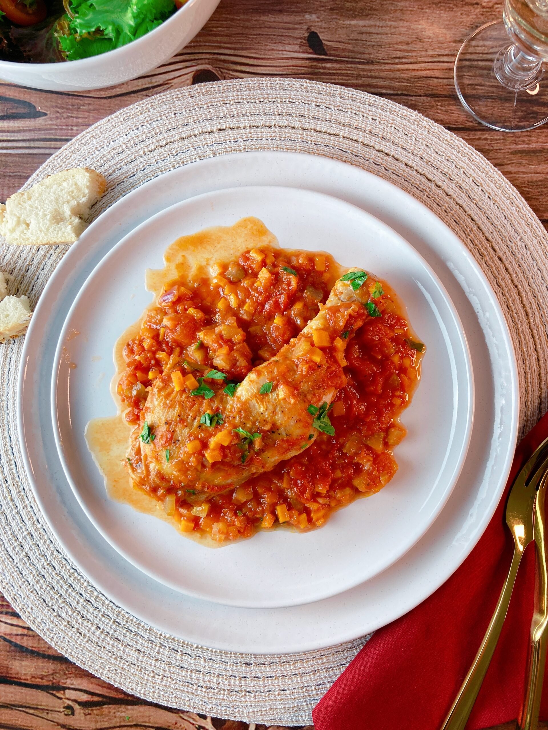 ⭐️ The wine changes the character of the dish: In many Italian homes, Chicken Cacciatore is made with red wine. In this version, I use white wine, which I usually keep on hand. Red wine creates a deeper, more robust flavor, while white wine gives a lighter, softer finish. After adding the wine, scrape up the flavorful bits from the bottom of the pan and let it simmer for 2–3 minutes to cook off the alcohol. What remains is aroma, not sharpness.