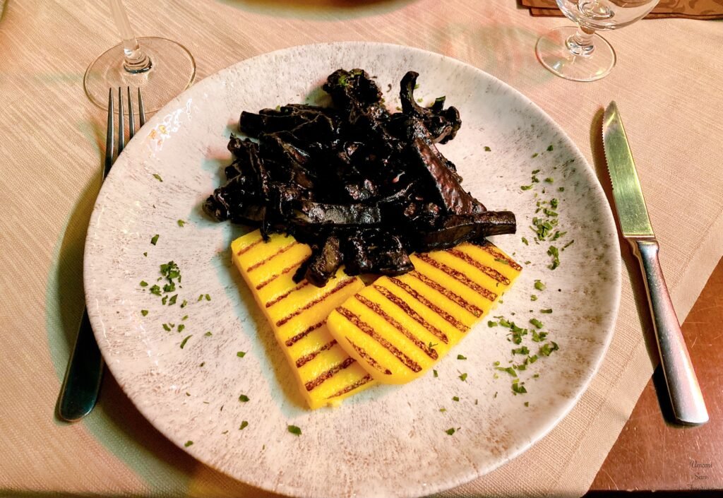 I ordered squid ink pasta again—this time served with polenta, a traditional Italian dish made from cornmeal, with a gentle flavor that pairs beautifully with rich sauces. Our daughters chose Margherita pizza, and my husband, as always, went for his favorite: Quattro Formaggi.